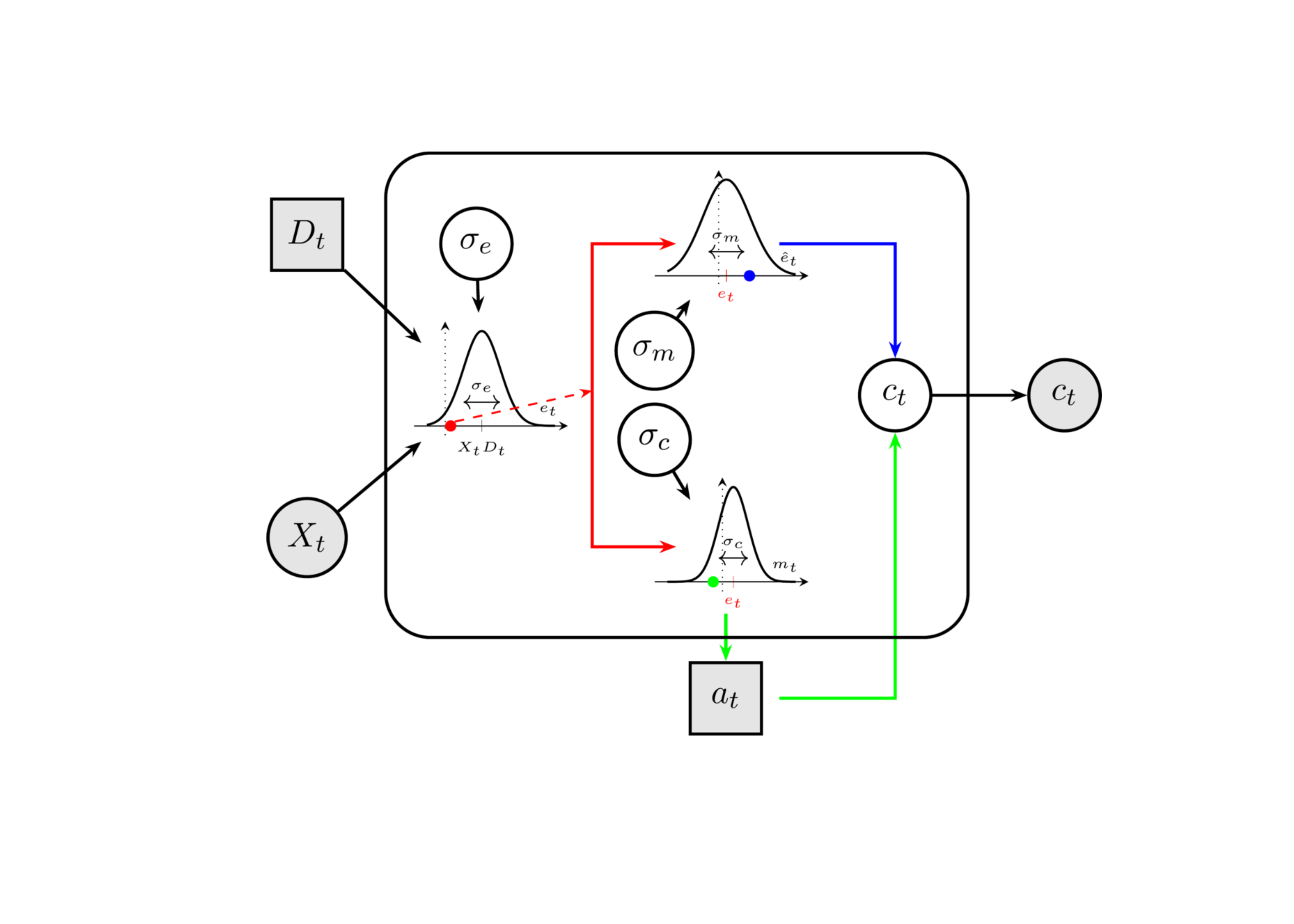 Because both \(e_i\) and \(c_i\) are normally distributed, their difference is also normally distributed and can be marginalized to obtain the probability of the action: