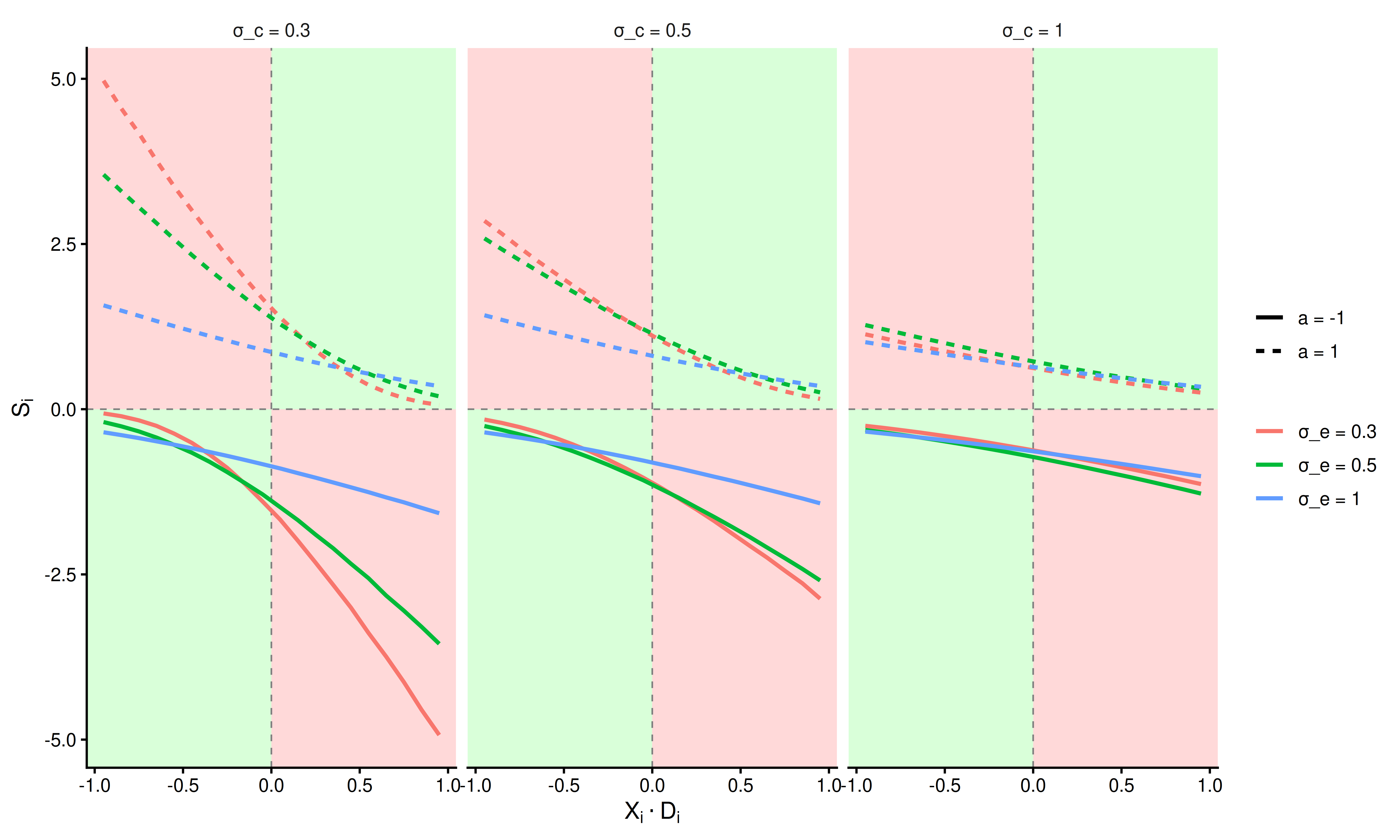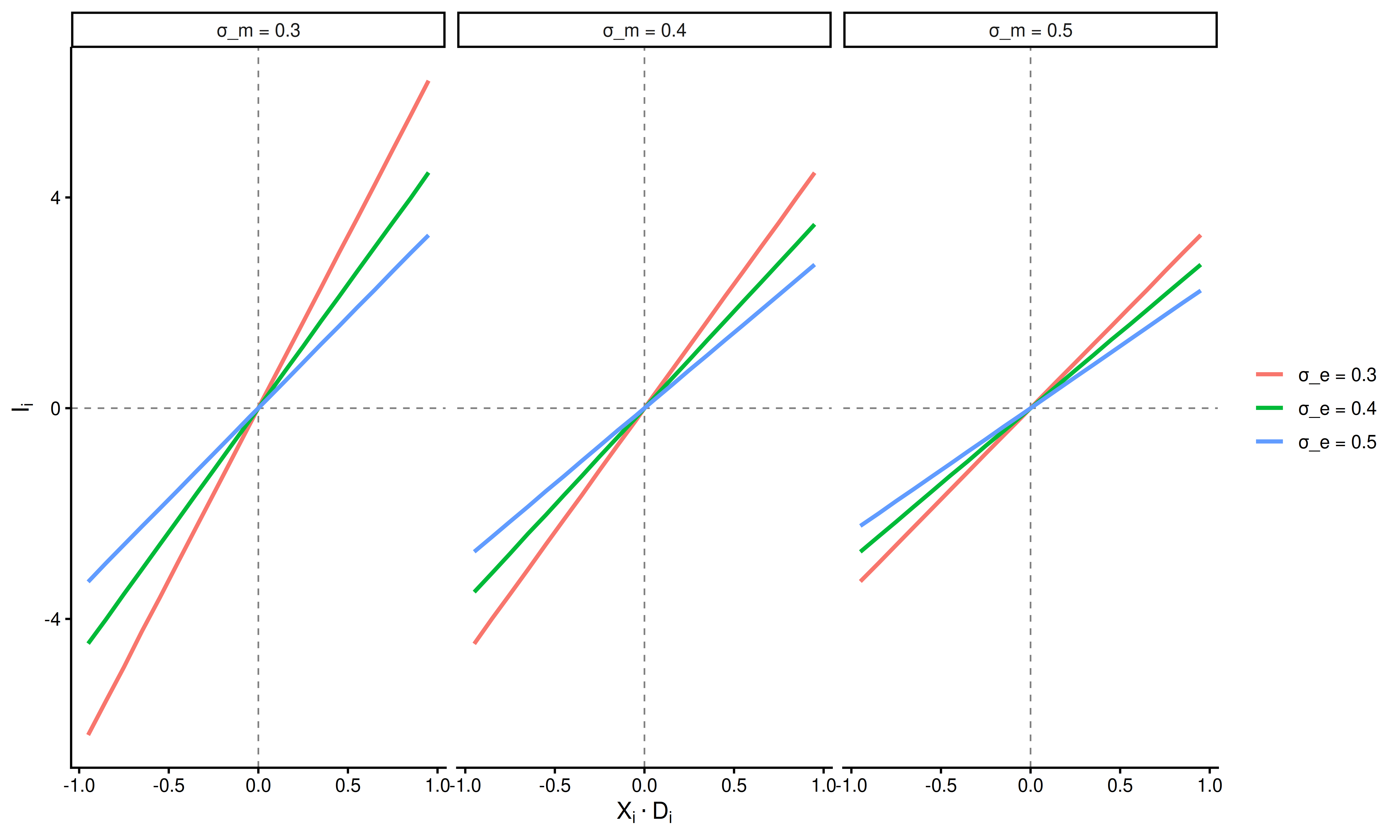 \[ e \mid D=1 \sim \mathcal{N}(X_i, \sigma_e^2), \quad e \mid D=-1 \sim \mathcal{N}(-X_i, \sigma_e^2) \]