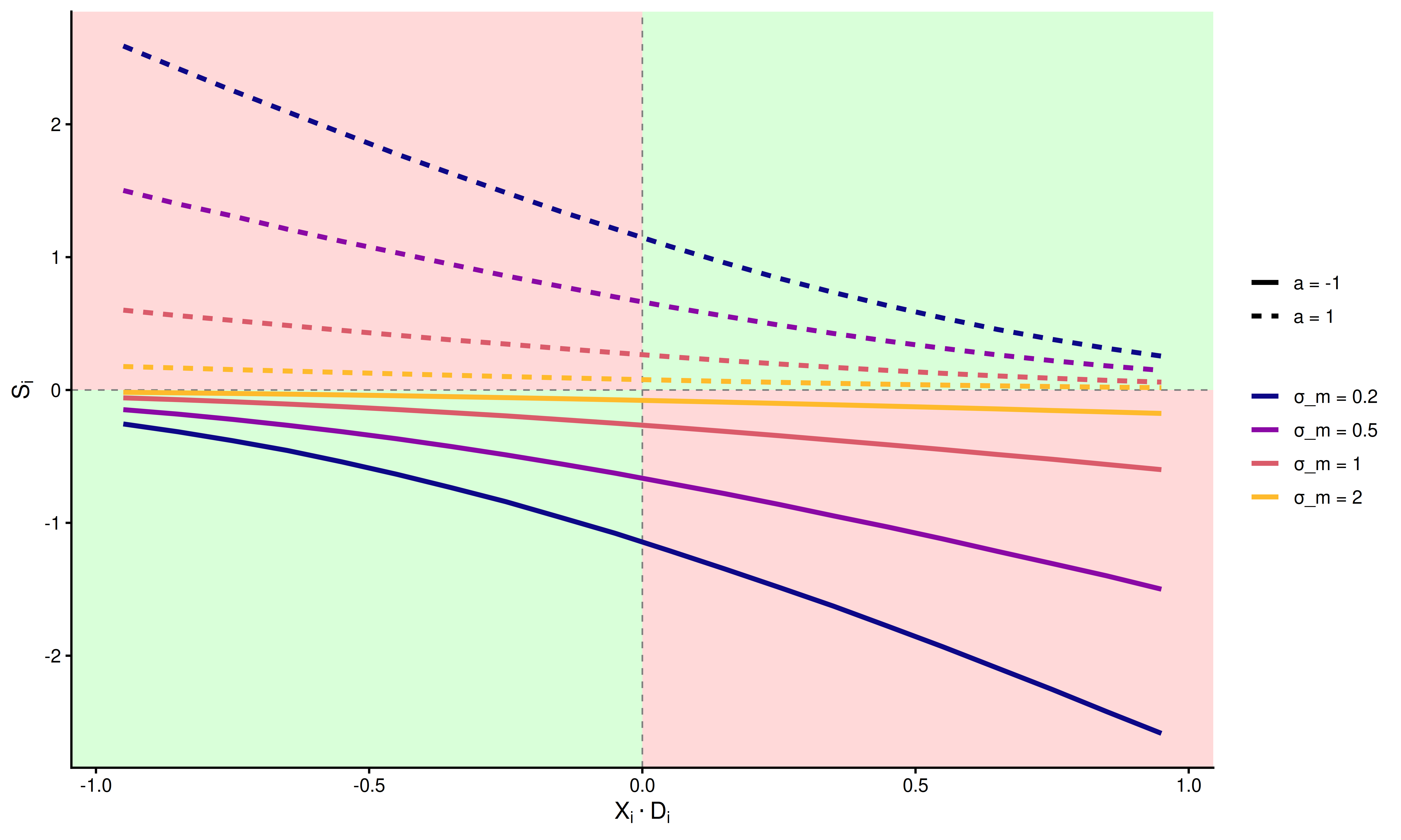 Next, we examine how the parameters influence the second term \(S_i\). First, we plot varying levels of \(\sigma_m\) with \(\sigma_e = 0.5\) and \(\sigma_c = 0.5\)