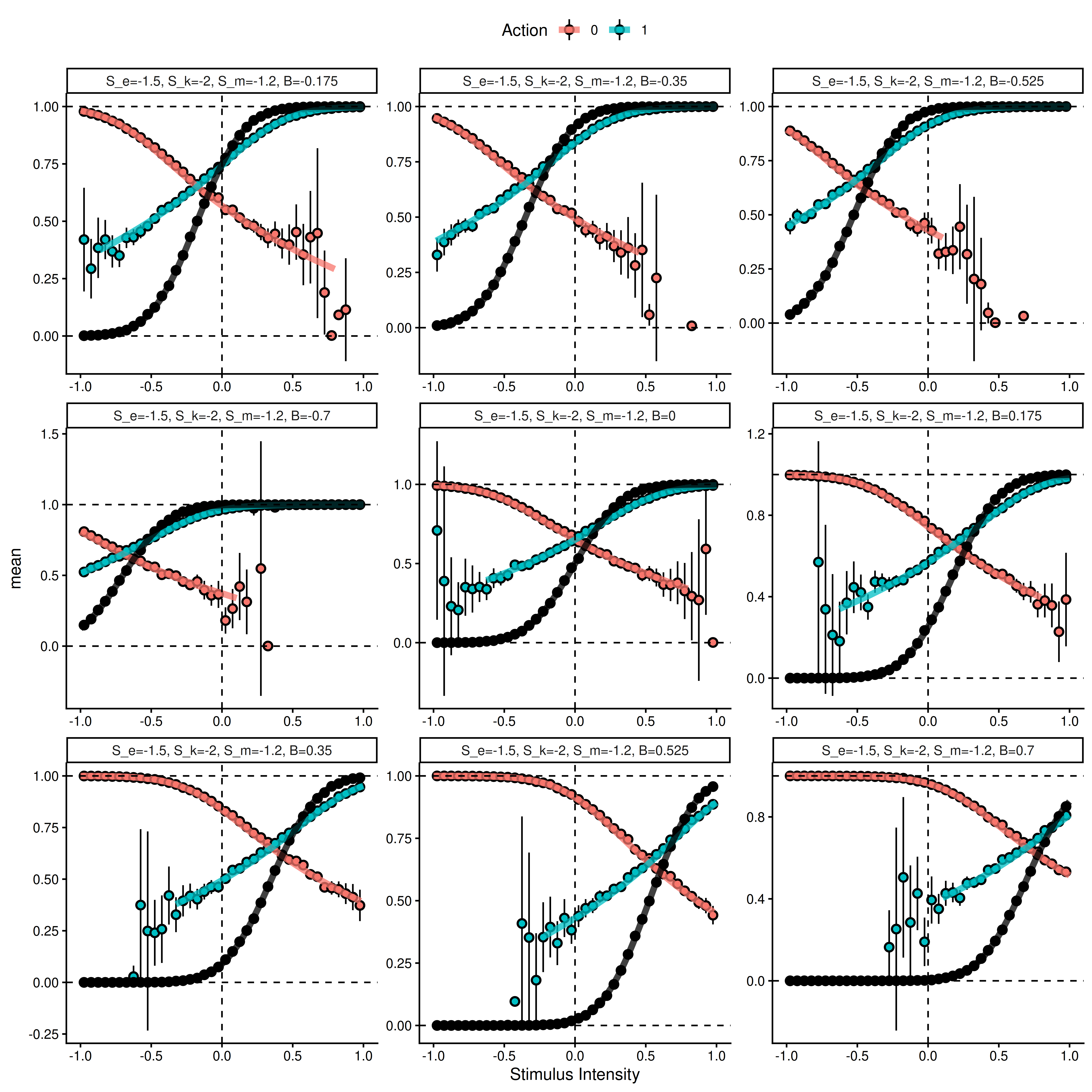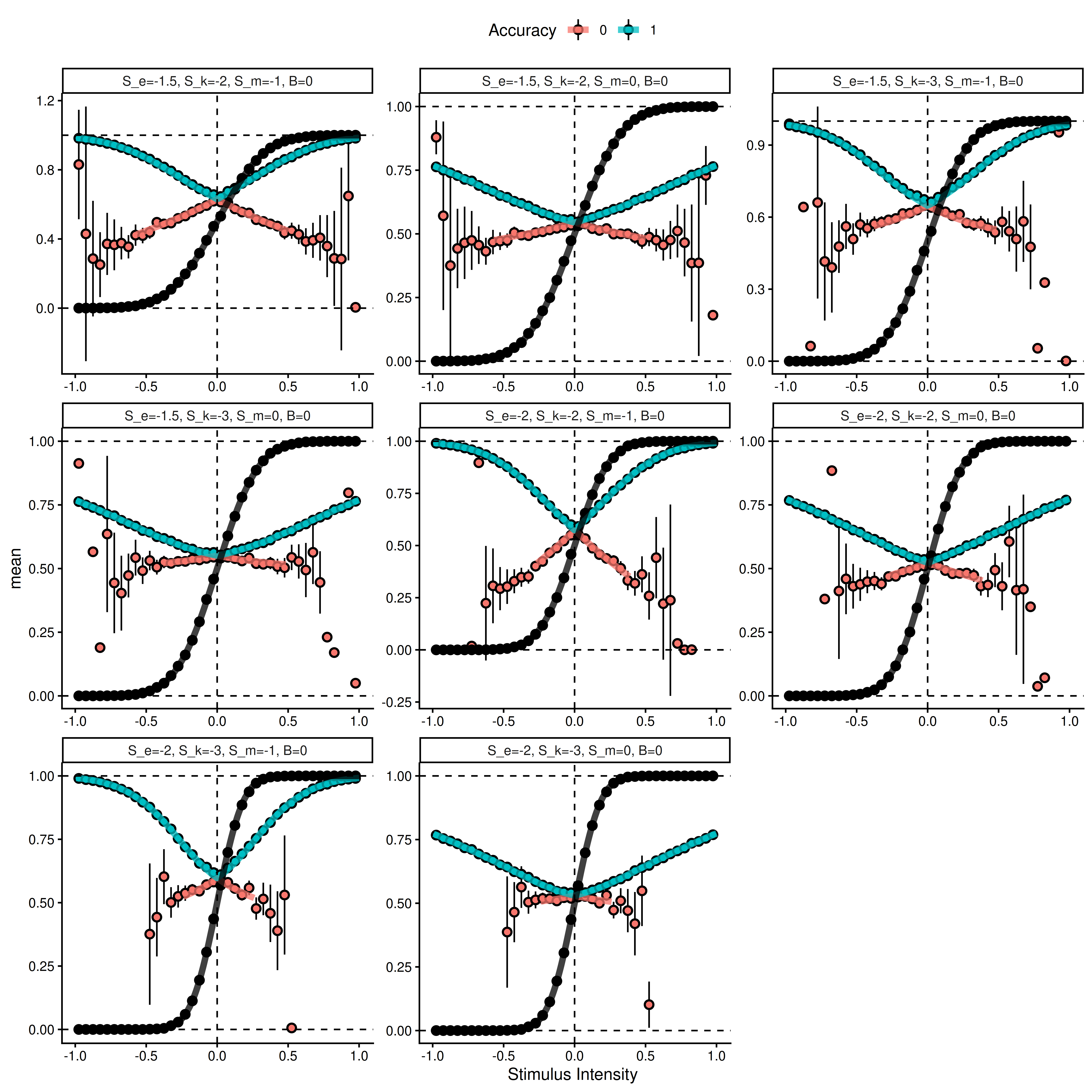 The above plot shows results from averaging 5^{5} simulated trials from equation (2) for each bin of the signed stimulus intensity scale (dots are means with approximate 95% intervals). The thick solid lines represent the marginalized heuristic model predictions.