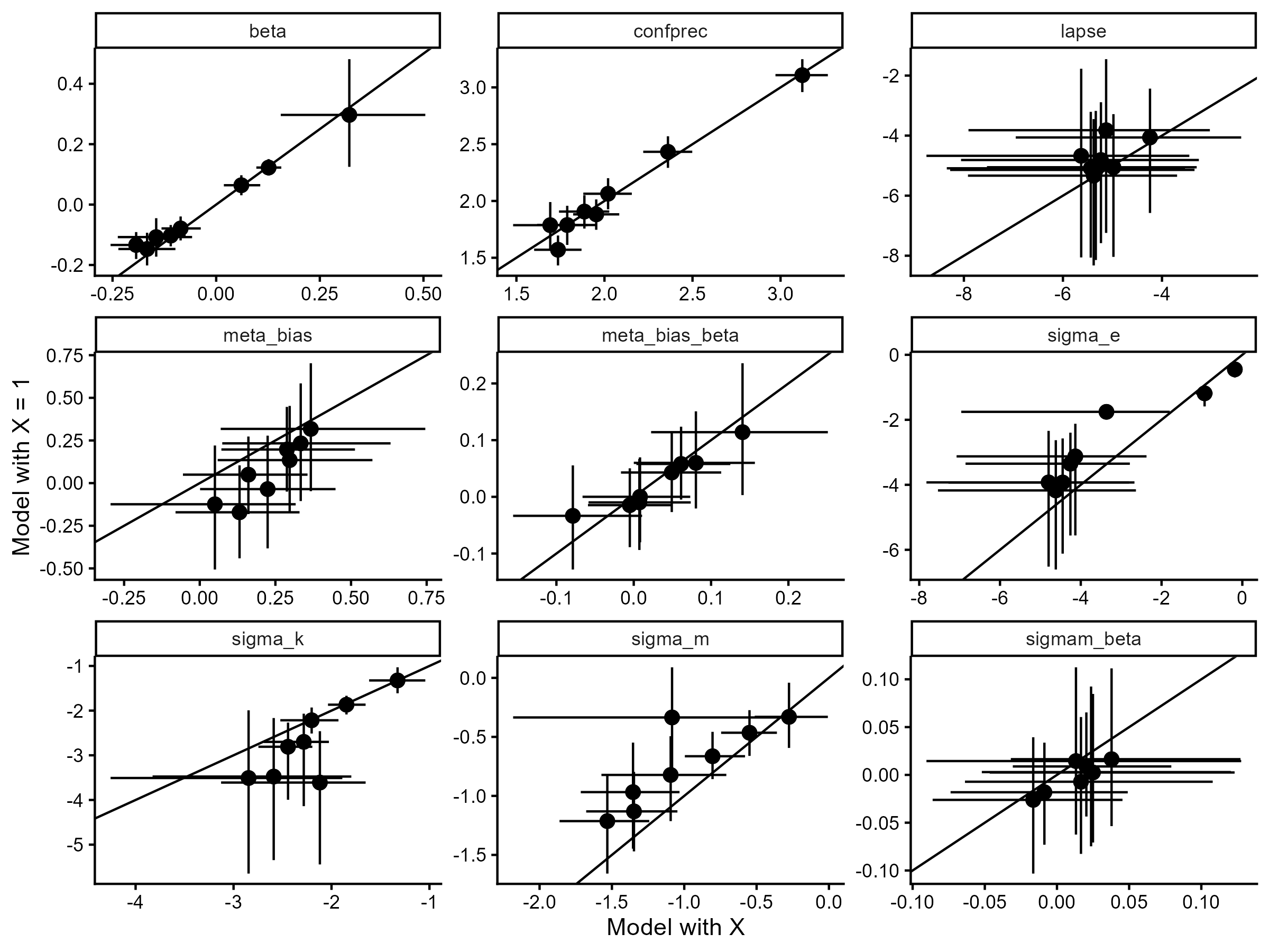 As a sanity check on the \(X_i = 1\) assumption, we fitted both hierarchical models to our pilot data and computed approximate leave-one-out cross-validation. The two models were virtually indistinguishable, with the difference in expected log predictive density being -1.58 \(\pm\) 9.9. A difference below \(-4\) or more than two standard errors from zero is generally considered evidence for one model over the other (REF); thus, at least in our pilot data, there is no difference in predictive performance. To further examine the distinction, we plot all pairwise parameter estimates below together with the identity line.