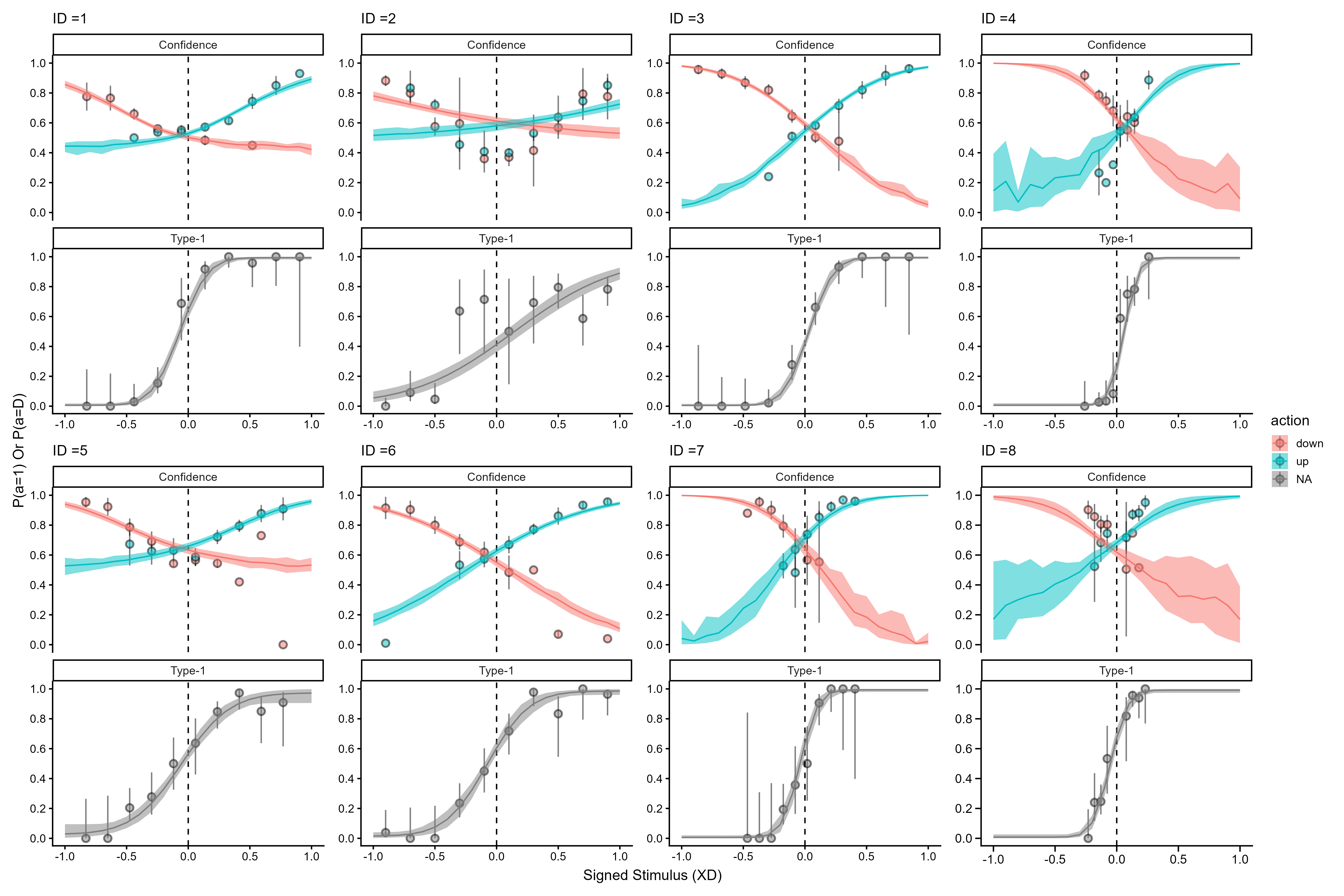 Instead, we assume that agents do not have access to this stimulus intensity and fix it to 1. This approach circumvents the computational difficulties mentioned above while remaining consistent with what the agent is assumed to have access to. It also allows the model to accommodate the empirical observation that the confidence curve follows the psychometric function of the binary choices. Below, we show that in our pilot data, the two models (fixing this stimulus intensity to 1 versus letting it vary with the true stimulus intensity) have equivalent approximate leave-one-out cross-validation performance.