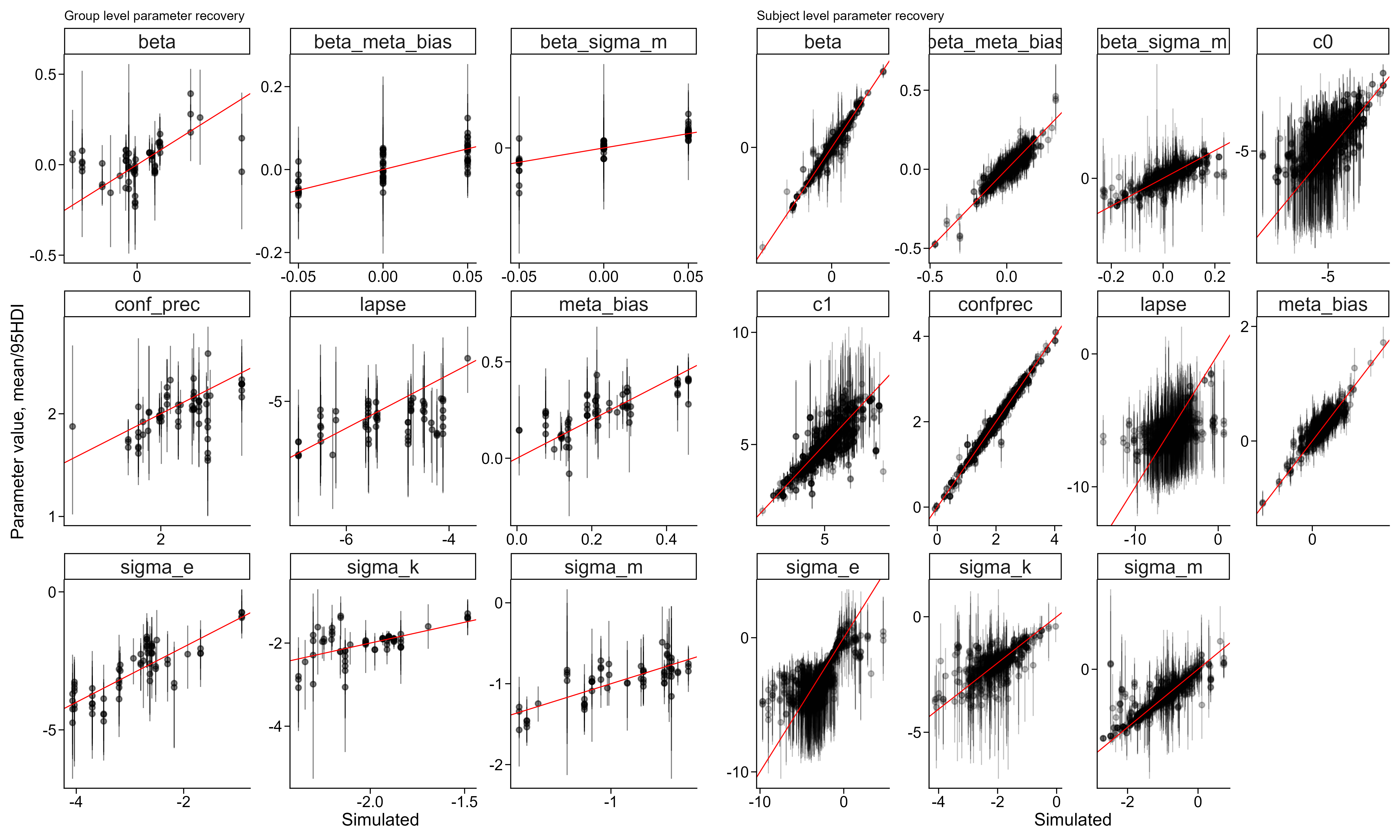 \[ \begin{align*} \tau_{\beta} &\sim \mathcal{N}(1, 1) & \text{(Between subject SD of threshold)} \\ \tau_{\sigma_{e_s}} &\sim \mathcal{N}(1, 1) & \text{(Between subject SD of encoding uncertainty)} \\ \tau_{\sigma_{c_s}} &\sim \mathcal{N}(1, 1) & \text{(Between subject SD of choice variability)} \\ \tau_{\sigma_{m_s}} &\sim \mathcal{N}(1, 1) & \text{(Between subject SD of meta uncertainty)} \\ \tau_{\beta_c} &\sim \mathcal{N}(1, 1) & \text{(Between subject SD of meta bias)} \\ \tau_{\gamma_s} &\sim \mathcal{N}(1, 1) & \text{(Between subject SD of lapse rate)} \\ \tau_{\kappa_c} &\sim \mathcal{N}(1, 1) & \text{(Between subject SD of confidence precision)} \\ \end{align*} \]