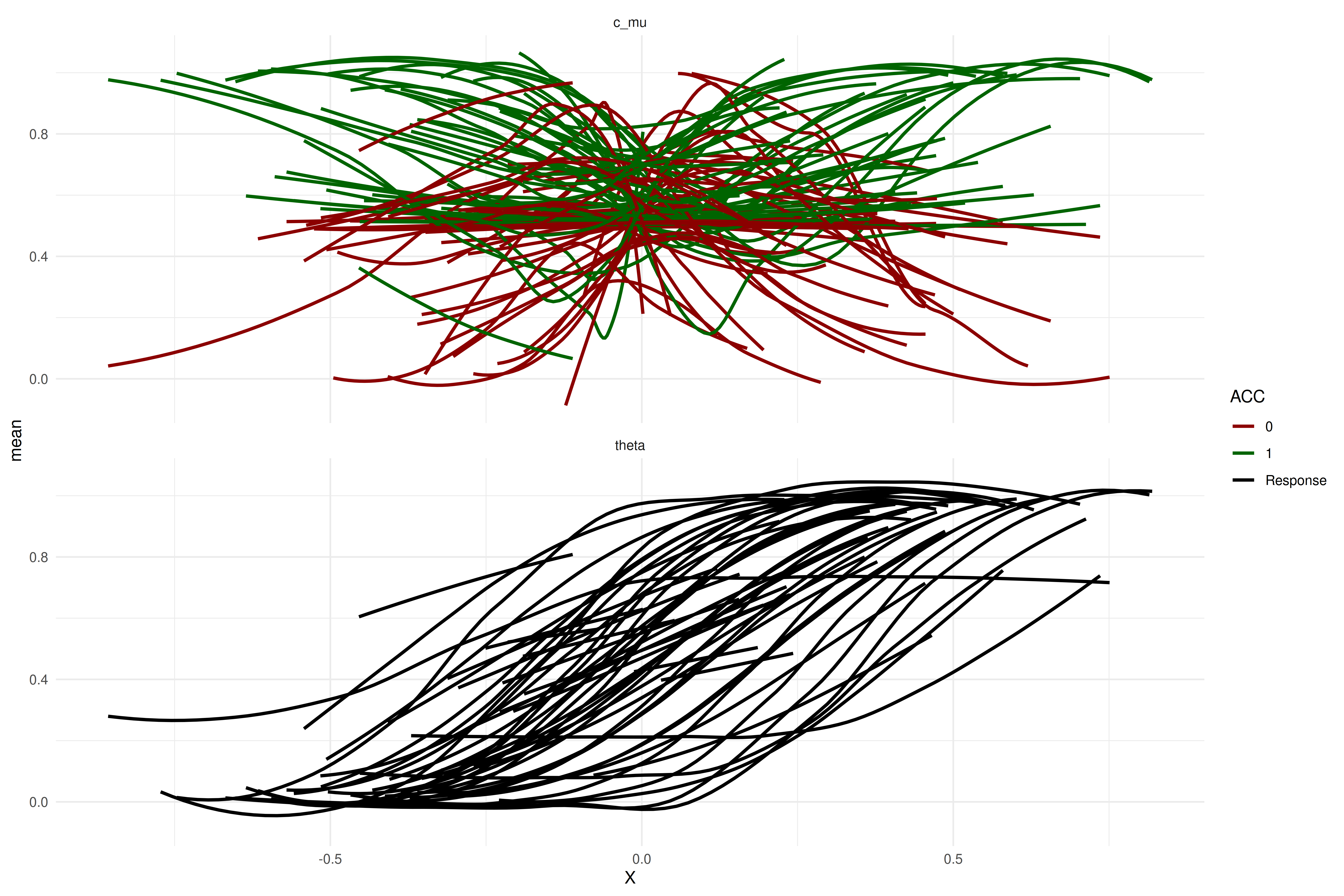 Because our sequential sampling approach uses Bayes factors for the termination of data collection, the prior distributions are highly influential. For transparency, we visualize the curves permitted by the prior below. Interested readers are also referred to the Sequential Sampling directory, which contains scripts for fitting, visualizing, and diagnosing our model.