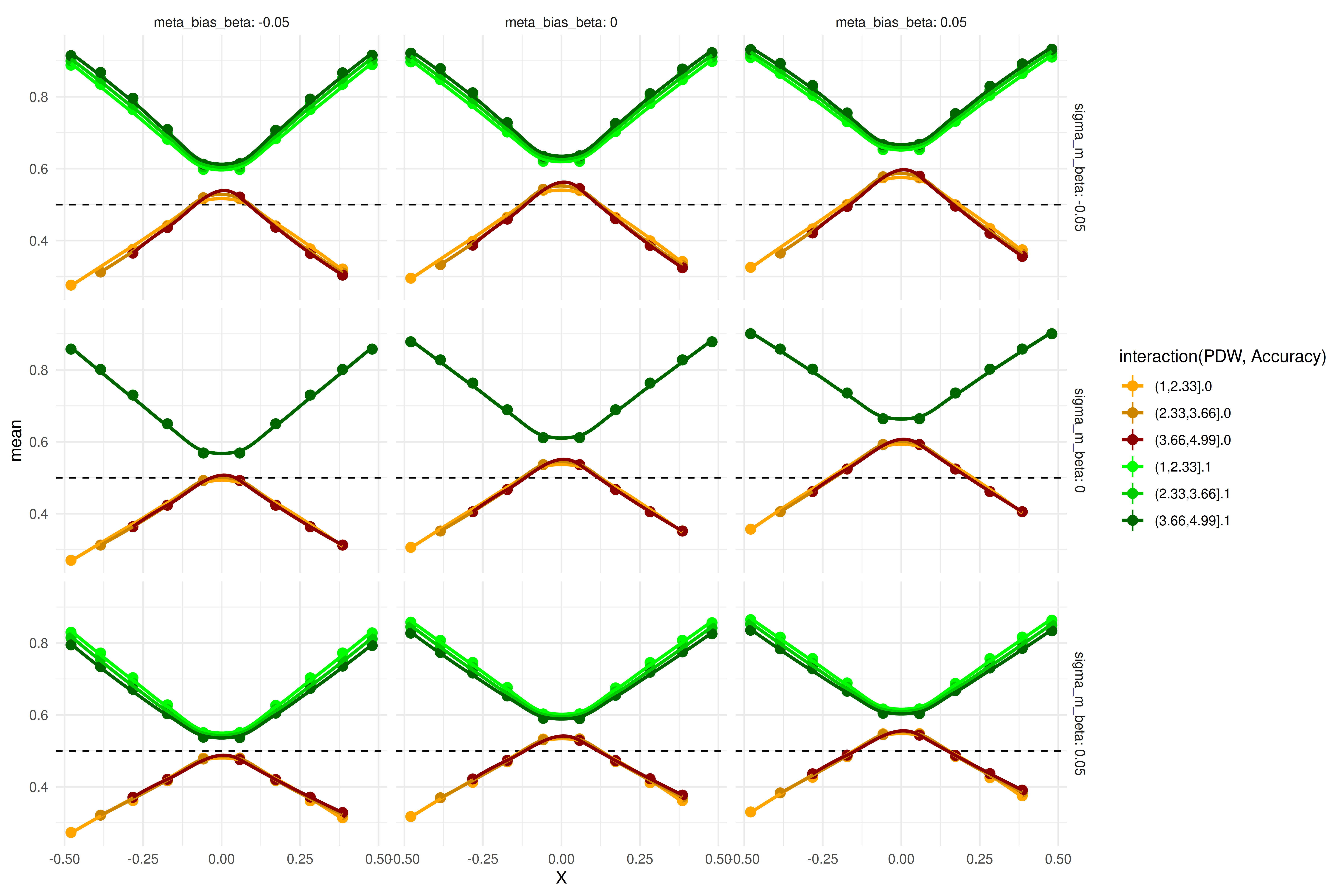 $$ \[\begin{align*} \mu_{\Delta{\sigma_{m_s}}} &\sim \mathcal{N}(0, 0.5) & \text{(group mean of effect of PDW on meta uncertainty)} \\ \mu_{\Delta{\mu_{\beta_c}}} &\sim \mathcal{N}(0, 0.5) & \text{(group mean of effect of PDW on meta bias)} \\ \tau_{\Delta{\sigma_{m_s}}} &\sim \mathcal{N}(0, 0.5) & \text{(Between subject SD of effect of PDW on meta uncertainty)} \\ \tau_{\Delta{\mu_{\beta_c}}} &\sim \mathcal{N}(0, 0.5) & \text{(Between subject SD of effect of PDW on meta bias)} \\ \end{align*}\] $$