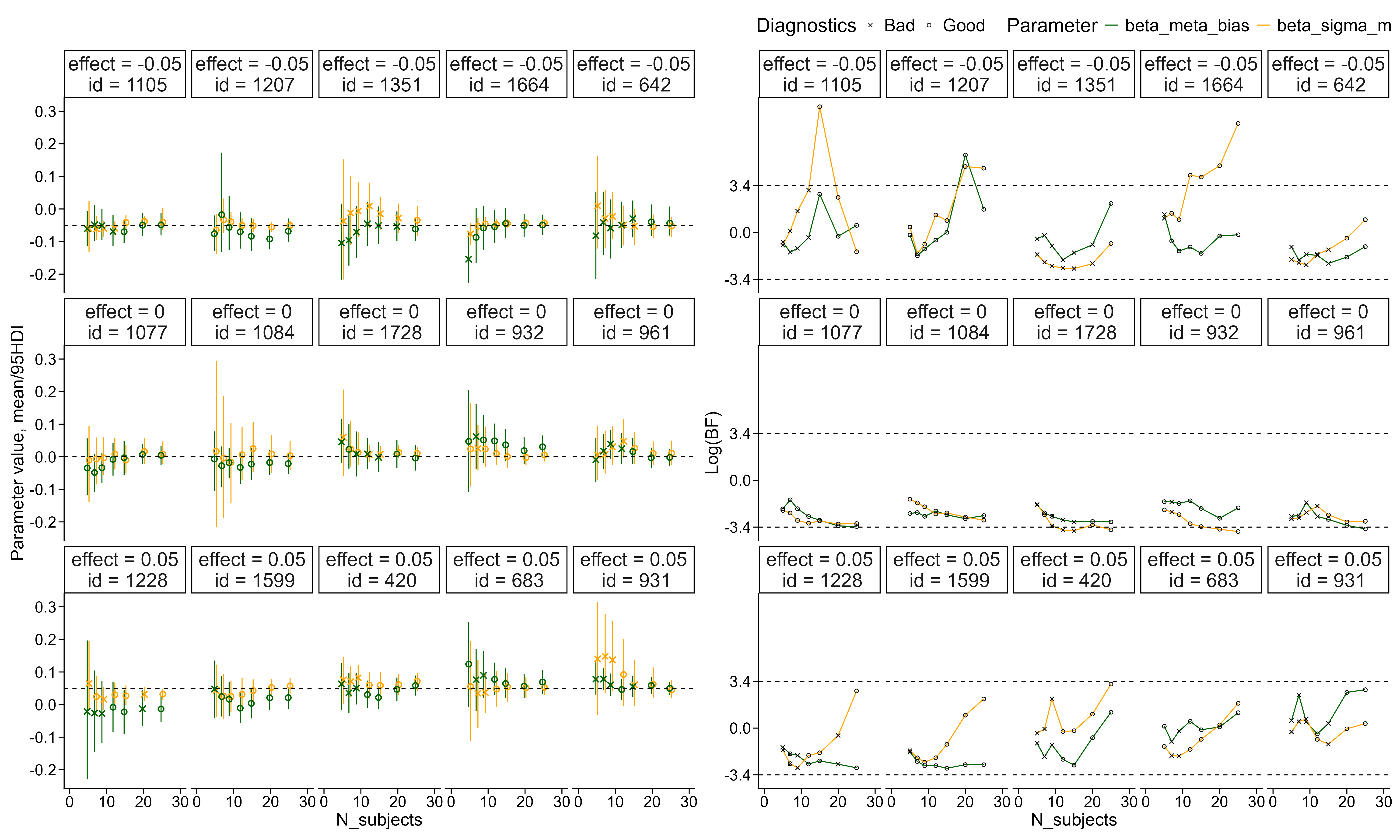 The above plot shows how the estimated effect of the interval between choice and confidence rating evolves for both metacognitive bias (green) and metacognitive noise (orange). Circles indicate fitted models without divergences, with effective sample sizes above 400 for both bulk and tails and \(\hat{R}\) values below 1.03. The left panel displays the posterior distribution of each parameter for increasing sample sizes. The right panel displays the corresponding Bayes factors for the same posterior draws fitted to our pilot data.