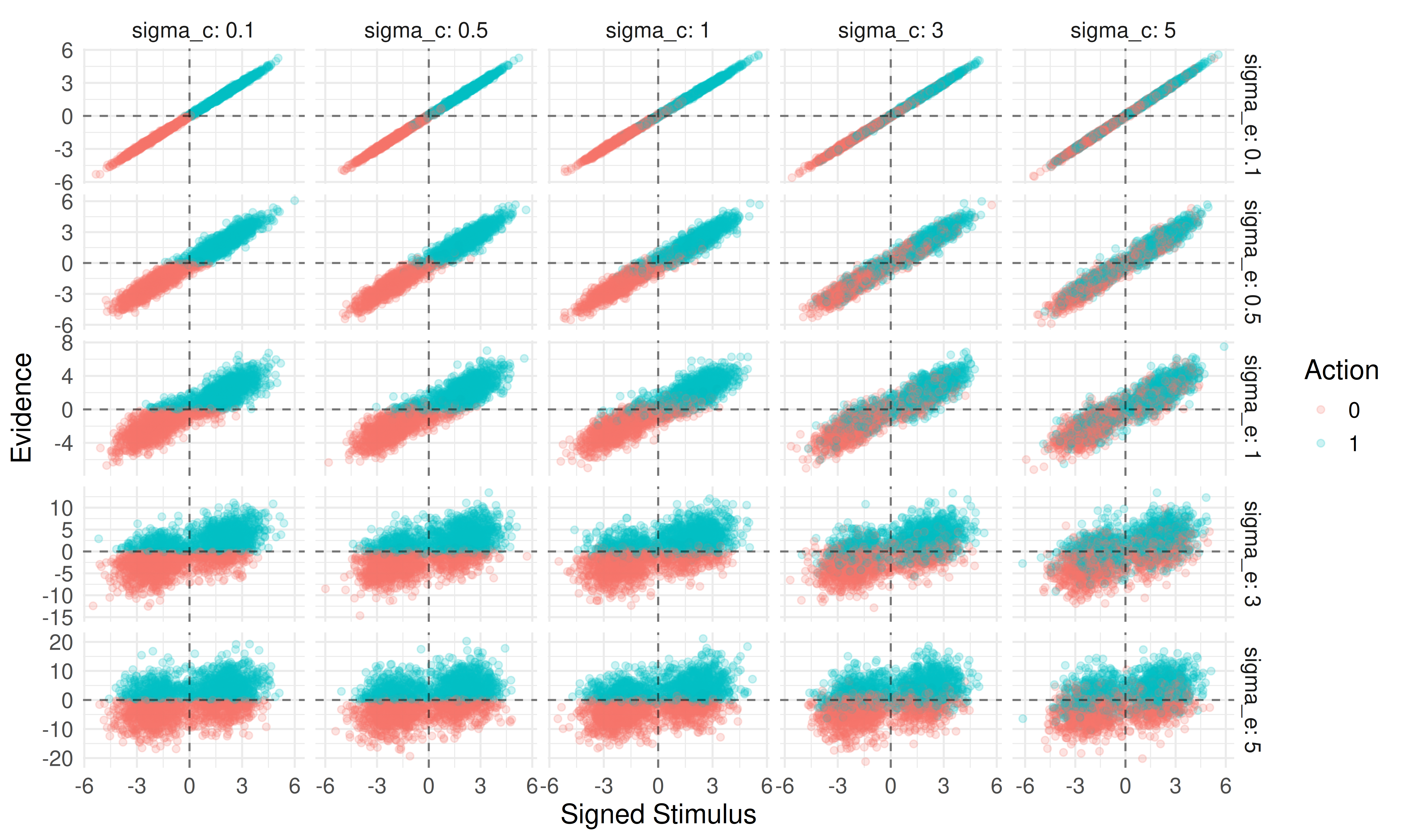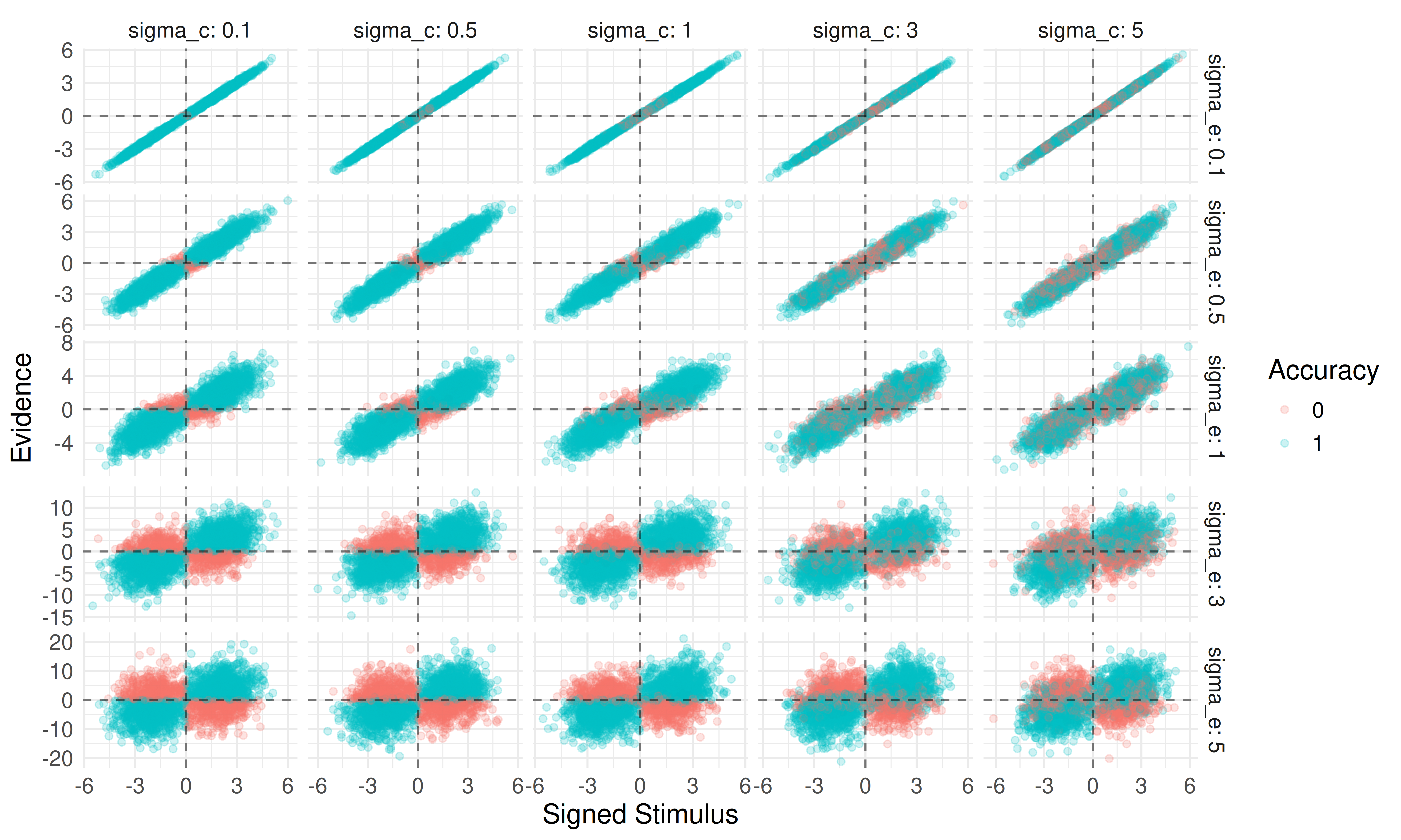 From the above plot we see that \(\sigma_e\) broadens the range of observed evidence (making it noisier for the same external stimulus); moving down the rows, the y-axis range greatly increases. When \(\sigma_c\) is low (left column), choices are consistent, positive evidence is paired with positive signed stimulus (i.e. D = 1), yielding a correct response. As \(\sigma_c\) increases this relationship becomes noisier, and correct and incorrect choices become less distinguishable across the zero-evidence line and zero-signed-stimulus lines.