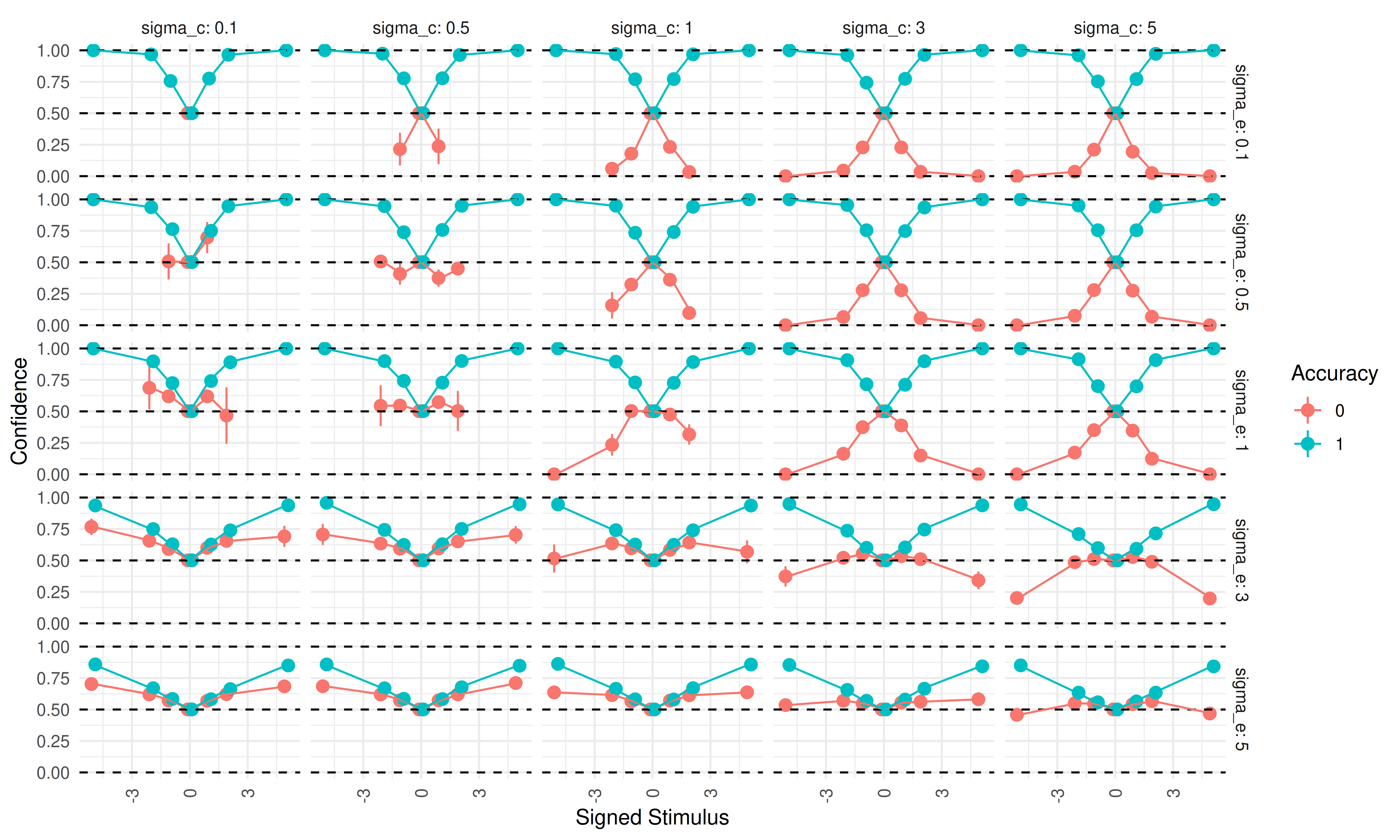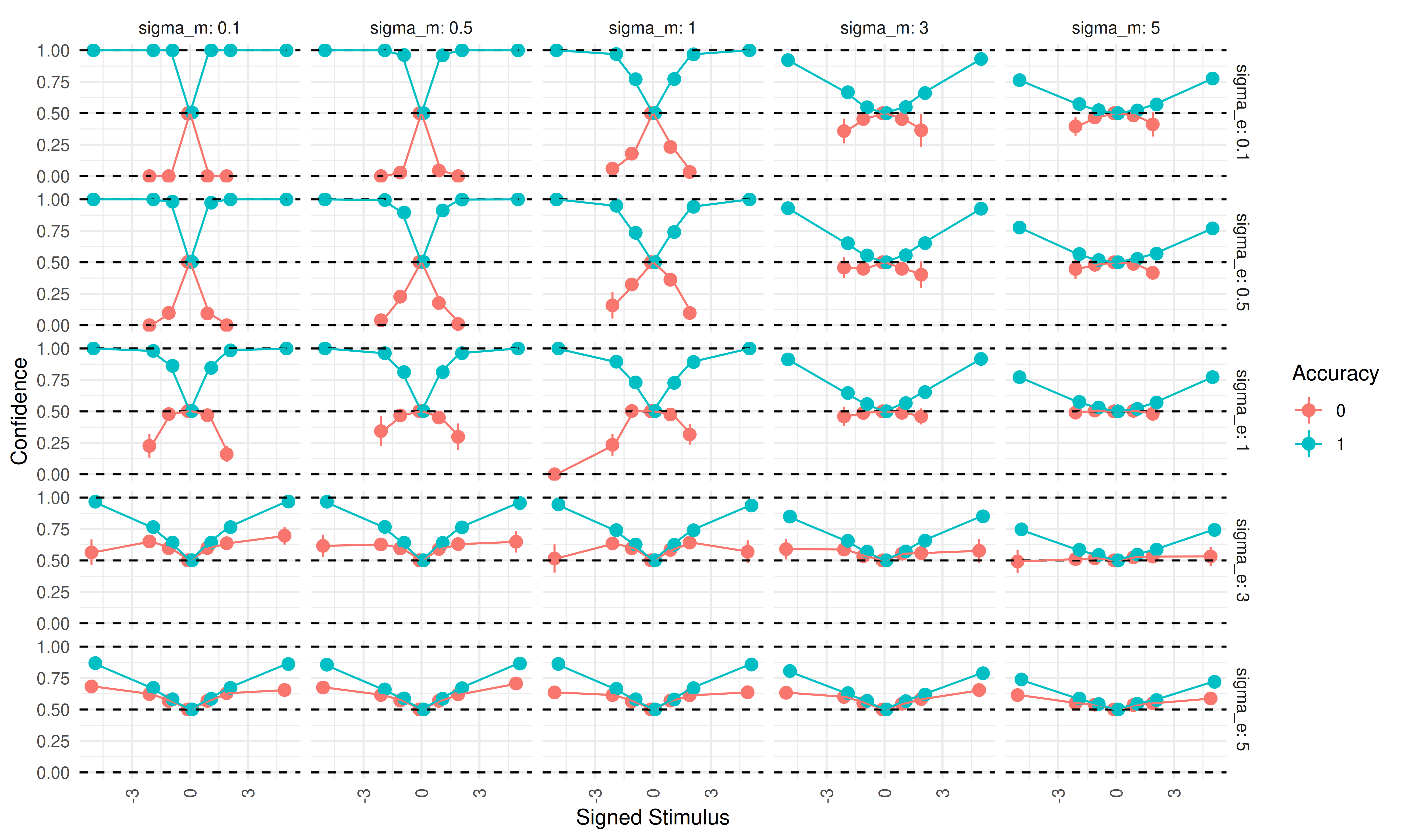 When confidence is plotted on the signed stimulus scale, a double-increase pattern emerges when \(\sigma_e\) is high (moving down the facets), and a folded-X pattern appears when \(\sigma_e\) is low (moving up the facets). As metacognitive noise (\(\sigma_m\)) increases (moving left to right), both confidence curves become increasingly flat (i.e., closer to 0.5) regardless of correctness.