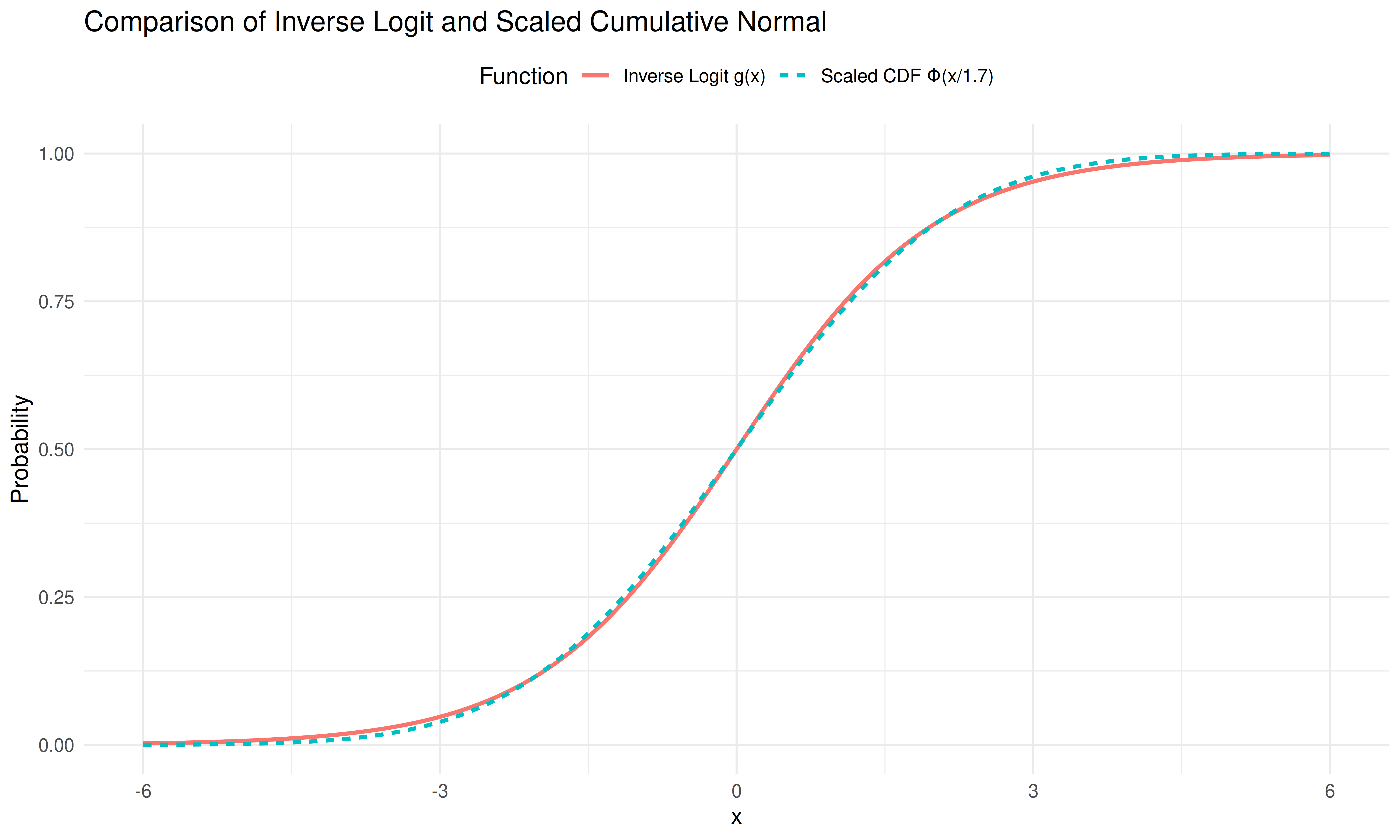 The inverse logit function and the cumulative normal distribution are in practice nearly indistinguishable up to a scaling constant, i.e., \(g(\cdot) \approx \Phi(\cdot / 1.7)\), as shown below: