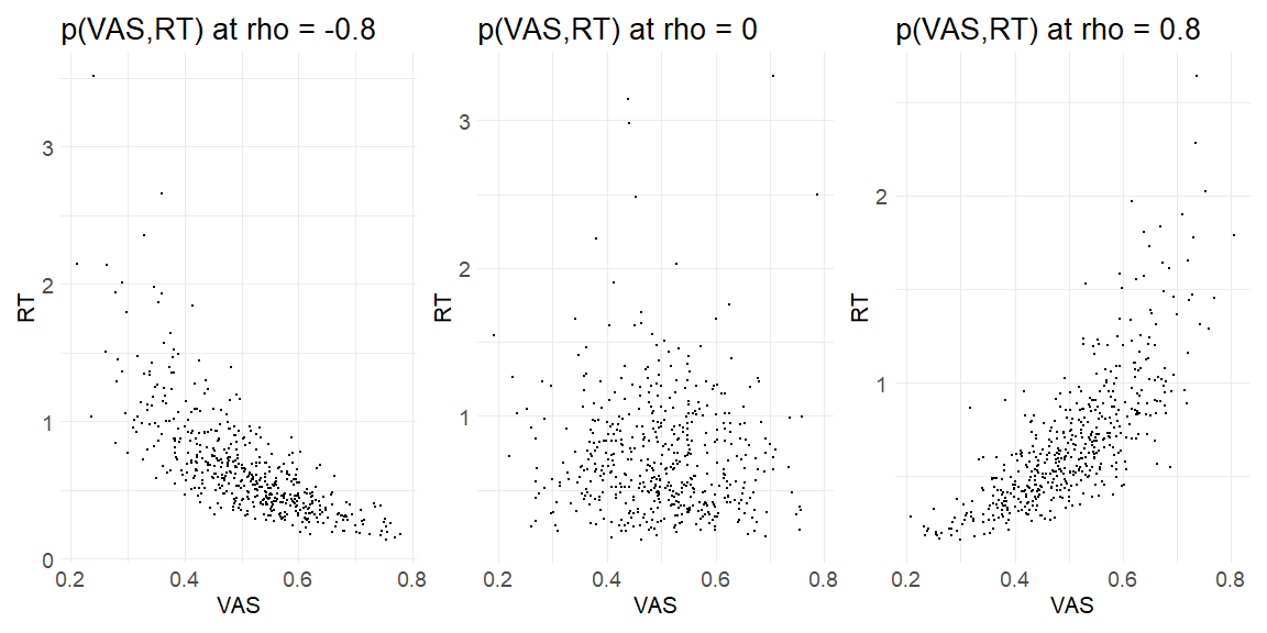 Simulating this we will start with a Gaussian copula with correlation coefficient ρ, then making these draws uniform with the guassian CDF and lastly using the inverse cumulative distributions of the distribution we want our VAS and RT random variables to be drawn from (the “observed” responses). We are going to do this for 3 cases, highly positive dependency ρ = 0.8, no dependency ρ = 0 and , no highly negative dependency ρ = −0.8. Further we assume for the marginal distributions of the VAS a beta-distribution with μ = 0.5,ϕ = 20 being the mean and precision respectively. For the RT’s we assume a lognormal distribution with μ = −0.5 σ = 0.5