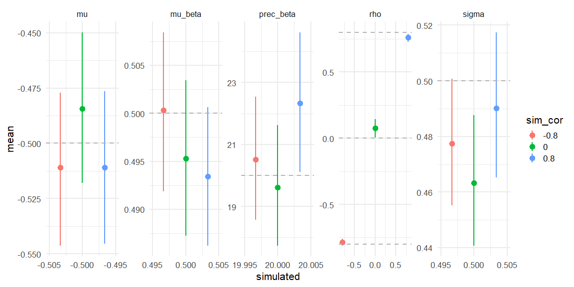 data = rbind(data.frame(fit_corm08$summary(parameters)) %>% mutate(simulated = c(0.5,20,-0.5,0.5,-0.8), sim_cor = -0.8),